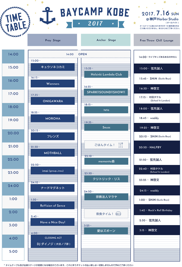 ドキドキとロックだけを発信する“BAYCAMP”の関西版として、今年初めて開催が決定した“BAYCAMP KOBE 2017”。いよいよ明日7/16(日)に神戸Harbor Studioで開催される。そのタイムテーブルが遂に公開となった。