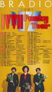 ニューシングルを引っさげ、5/1からはBRADIO初の47都道府県ツアー“IVVII Funky Tour” (読み「ヨンナナファンキーツアー」)がスタート。9月まで約4ヶ月間で47都市49公演を走り抜ける。さらに、7/26にはBRADIO2度目となる海外ライブ“OTAKON”への出演も決定した。