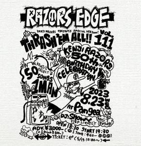 RAZORS EDGEは1996年に結成され今年で活動27年目の日本を代表するスラッシュハードコアバンド。 その唯一のオリジナルメンバーであるボーカルKENJI RAZORSが8月23日に50歳の誕生日を迎えるにあたりワンマンライブの開催を発表した。 内容は50歳にちなんで50曲披露するというファンにはたまらない内容。 お祝いに盟友STEP LIGHTLYのボーカルSHOWYもDJとして参加。チケットは5月13日の10時からイープラスで発売される。▼イベント情報2023.8.23(水)心斎橋PangeaKENJI RAZORS 50th birthday celebrationTHRASH‘EM ALL!! Vol.111<出演>RAZORS EDGE(ワンマン)【DJ】SHOWY(STEP LIGHTLY)<OPEN/START>18:30/19:30<ADV/DOOR>3000円/未定 (+1drink600円)<チケット>— 5/13(土)10:00 発売 —■e+購入ページURL:https://eplus.jp/sf/detail/3874030001-P0030001 <お問合せ>06-4708-0061(Pangea)▼最新リリース情報(ALBUM)アーティスト:RAZORS EDGEタイトル:THRASH‘EM ALL!! Re-Recording 2020 Edition発売日:2020.6.3品番:PCD-26077/8(2CDs)felicity cap-327税抜価格:¥2,600-発売元:felicity販売元:PCI MUSIC<RAZORS EDGEプロフィール>1996年、KENJI RAZORSを中心に大阪で結成。