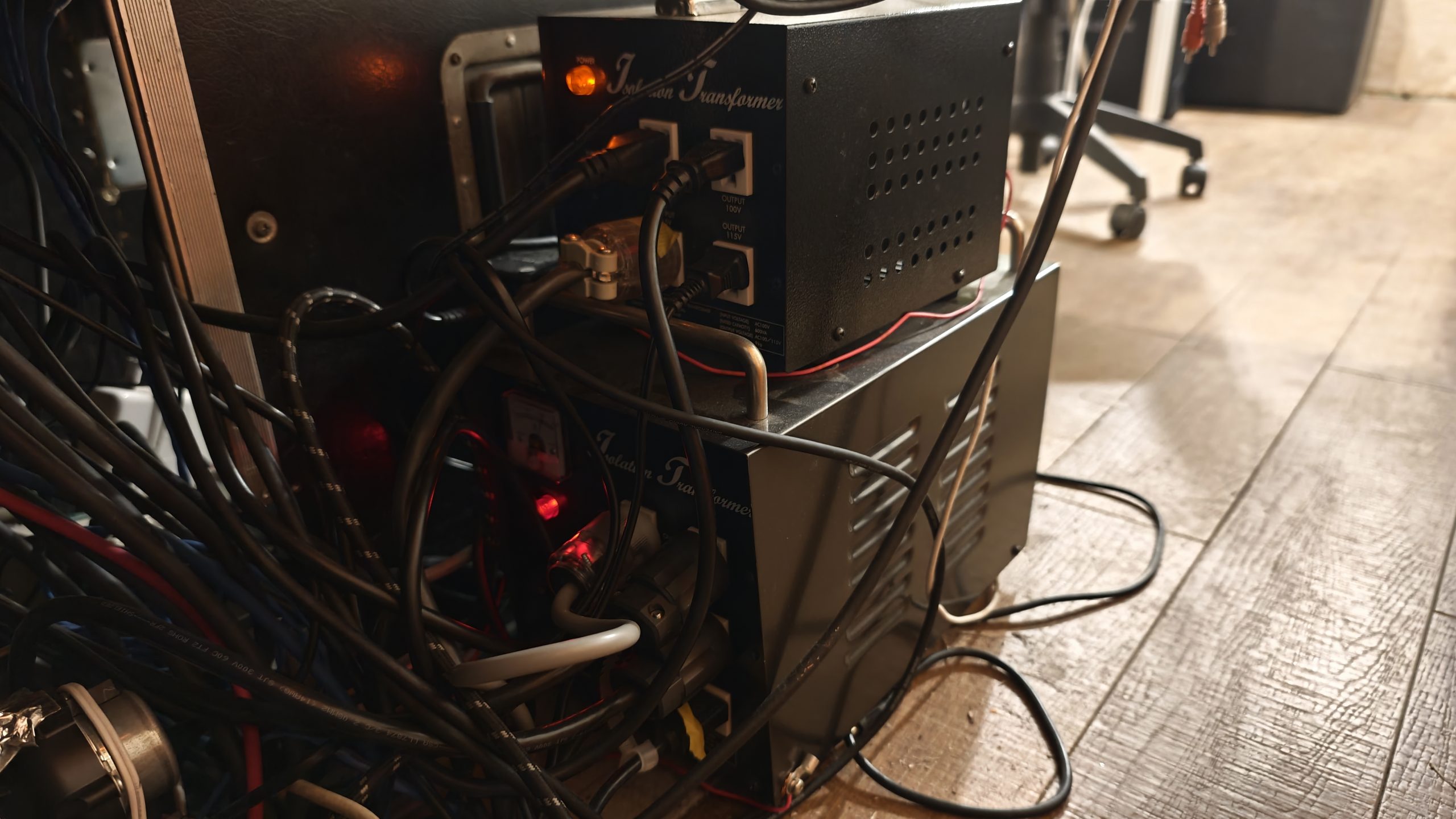 電源は200V入力から10Aアイソレーショントランスで115Vを生成し、さらに5Aトランスで再絶縁するダブルアイソレーション構成です。