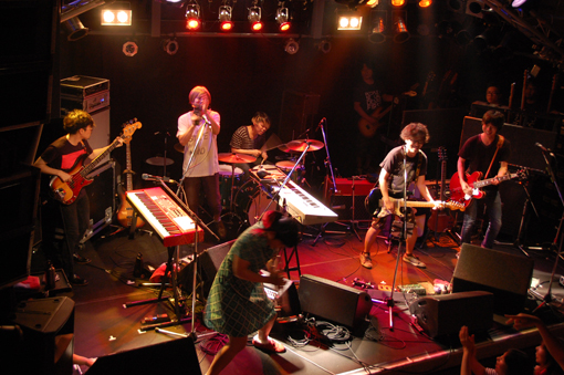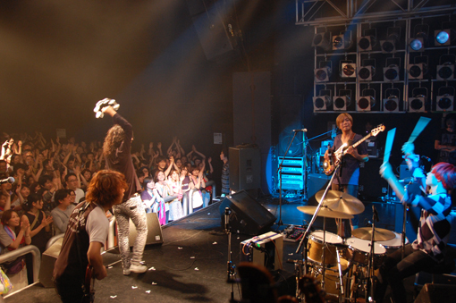 DISCOVERY Q-SYU6本目 佐賀GEILS!! この日からOKAMOTO'Sが合流し2バンドでの対バンツアーとなりました。写真はくるりのアンコールにハマ君の飛び入りで演奏された「everybody feels the same」この時佐藤さんはベースではなくタンバリン&コーラスで参加!! その後は「お祭りわっしょい」にOKAMOTO'S全員が参加してくれました!!