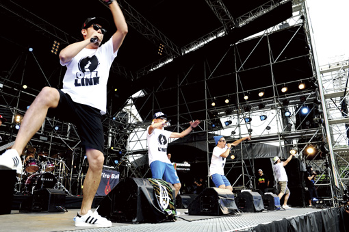 「純恋歌」のイントロが流れ出すと、会場がにわかにざわめき出す。そして「目を閉じ……てると終わっちゃうよ~!」と遊び心たっぷりのオープニングで湘南乃風がスタート。「ジャンルなんか関係ねぇ! 音楽好きは手挙げろ!」とHAN-KUNが煽れば、それに応えて誰もが腕を高く突き上げる。さらに「曖歌」ではメンバーと共に歌うファンたちの姿も数多く見受けられた。究極のサマーチューン「睡蓮花」に入ると、オーディエンスはおもむろにタオルを取り出し、サビに合わせて勢いよく回し出す。これぞ湘南乃風の十八番! さらに若旦那とHAN-KUNがステージから降りて、スタンディングエリアの柵越しにお客さんと触れ合い、走り回る。確かに本日出演したアーティストたちとはまったくカラーの違う彼らだが、本人たちの言う通り、音楽好きにジャンルなんて関係ない。音の上で、アーティストとオーディエンスがひとつになった瞬間を目にした。