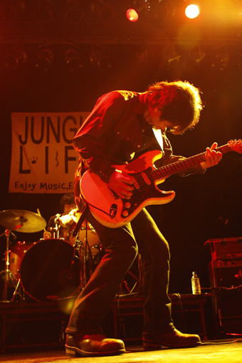 お次はTOMOVSKYのお出ましだ。新春なのにサンタの衣装でオドケテみせ、19歳の後に47歳のパワーとセンスをいかんなく発揮。やはりTOMOVSKYの音楽は、音作りとアレンジが秀逸だな。心に沁み、次への活力を生み出してくれる。まさにミュージック・ビタミンだ。続いては、ロックンロールの惑星から飛来した“ジェットロックンロールの申し子”ギターウルフ。スタートからすでにデッドヒート状態。U.Gのベースが激しく縦横無尽に暴れまくり、トオルのドラムが稲妻を呼び込む。セイジはギターと一体になり全身を痙攣させている。3人の高ぶる魂の競演は時間を忘れさせ、その狂ったバイブレーションに脳をやられてしまう。しかし、彼らは決して凶暴でもなく下品でもない。どこかコミカルで優しさを垣間見せるのだ。それは決して作られたものではなく滲みでてくる人柄にあると感じた。ファンをステージにあげ、ギターを弾かせて歌うセイジ。客席にダイブを繰り返し歌うセイジ。ギターウルフが世界で人気を持続させている要因はやはり“ロックンロールの神様に愛されているからだろう”とひとり納得した。