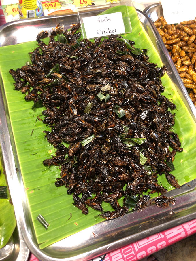 近くのナイトマーケットに到着し、お互いの衣類を購入して晩ごはんを食べることにします。とにかく物価が安く、Tシャツは150バーツ程度。それにタイの料理はどれも大変美味しく、「タイ最高!」とテンションが高い2人。まるでお祭りのごとく人があふれるナイトマーケットをキャッキャ言いながら散策し、明日からの2人の衣類を買ったり昆虫を食べたりしつつ、初めてのタイを満喫します。