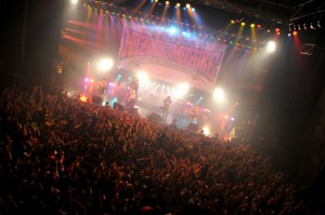 開場前のリストバンド交換には、目を見張るほどの長蛇の列ができていた。それはそれは並ぶのもしんどいのではなかろうかと思うほど。列に並びながらまだかまだかと胸を膨らませる人々。それは“OSAKA HAZIKETEMAZARE FESTIVAL 2012”には期待とわくわくが詰まっていることを意味する。そして心斎橋•アメリカ村のシンボル、三角公園はどんちゃん騒ぎ。既に酔っぱらっていたり、これからのライブのために準備運動していたり。半袖で行動しているキッズもたくさん! この寒空の下、アメリカ村を自分たちの遊び場に変えていく元気いっぱいのキッズたち。さぁ、今年もなにもかも忘れてハジケテマザレ!
